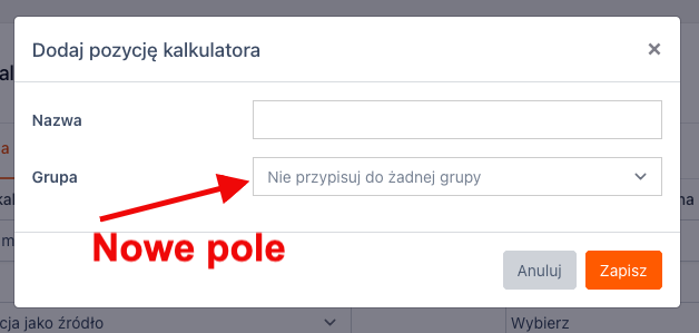 W momencie dodawania nowej pozycji w kalkulatorze, użytkownik ma możliwość przypisania jej do jednej z wcześniej utworzonych grup.