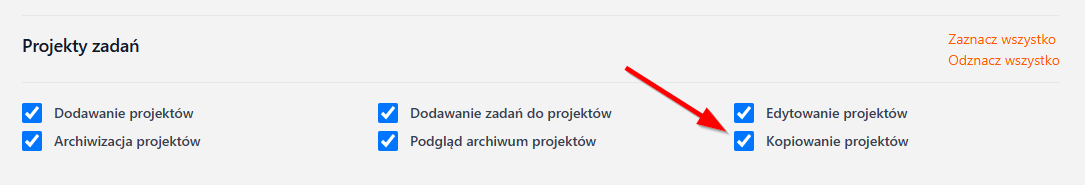 – wszystkie zadania powiązane z projektem (w obrębie zadania kopiujemy: osoby odpowiedzialne, osoby powiązane, role odpowiedzialne, pliki zadania, tagi zadania).