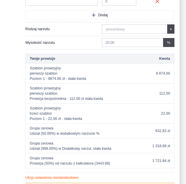 Uprawnienie umożliwia wyświetlenie prowizji użytkownika, który tworzy kalkulację, nawet jeśli nie posiada on dostępu do sekcji „Pokaż wyliczenia”.