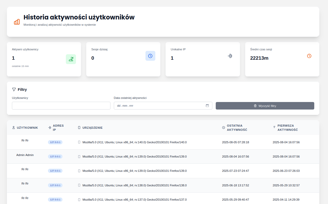 Ta sekcja umożliwia przegląd historii logowań wszystkich użytkowników systemu. Wyświetlane są następujące informacje: