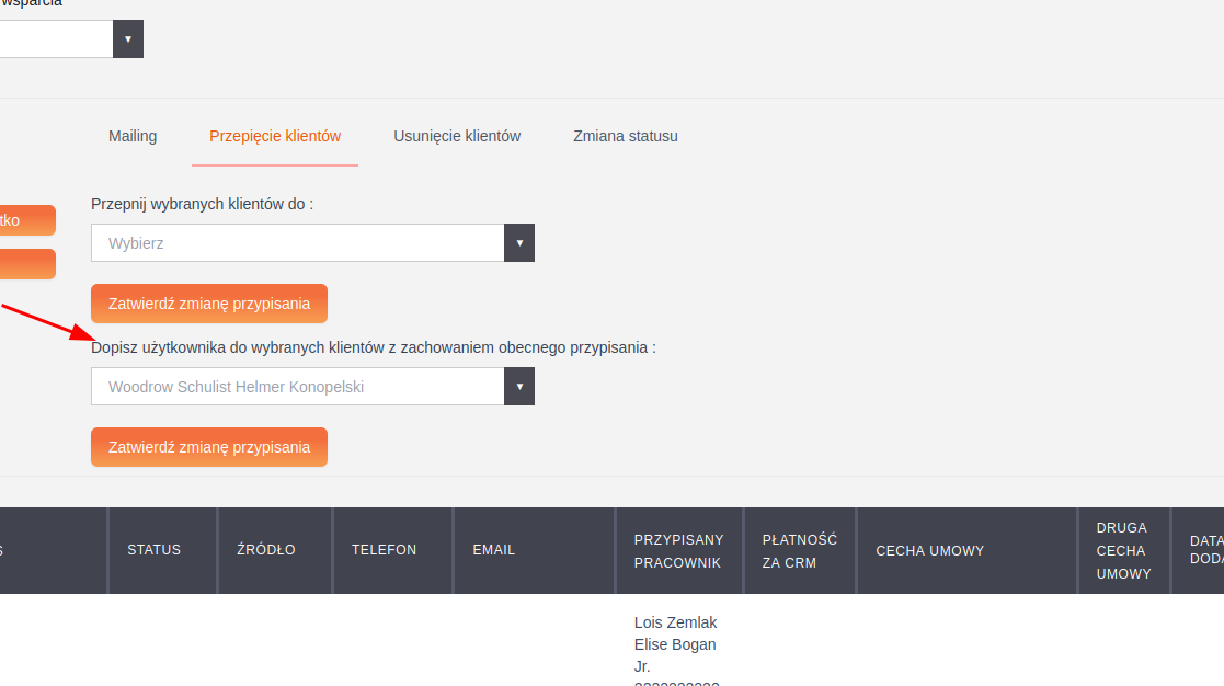 W module Klienci, w zakładce – Przepięcie klientów, dodano nową akcję masową umożliwiającą dopisanie użytkownika do wybranych klientów z zachowaniem dotychczasowych przypisań.